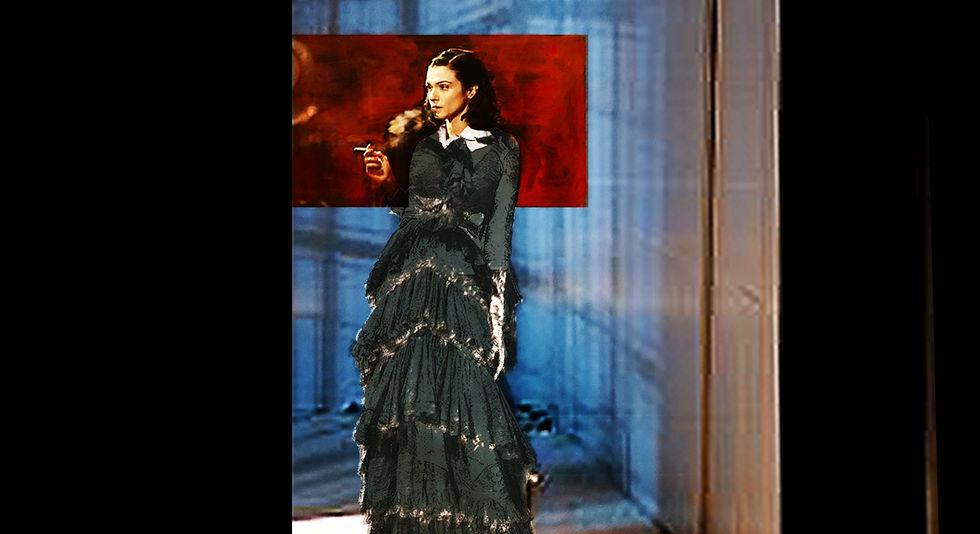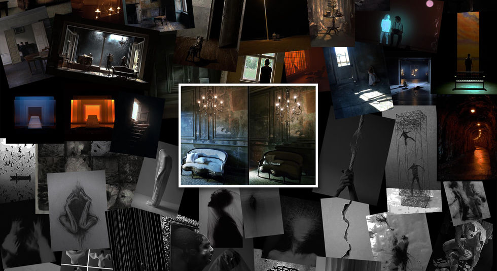 This scenographic proposal captures a space where the dominant elements are the sense of abandonment, worn wood, anxiety and anticipation. In her quest to conquer the space and the people around her, the protagonist places luxury objects such as the chandelier and wallpaper on the walls in the frayed and aged living room.